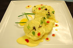Pour Huancaina sauce over potatoes and garnish with slices of hard-boiled egg and black olive halves.